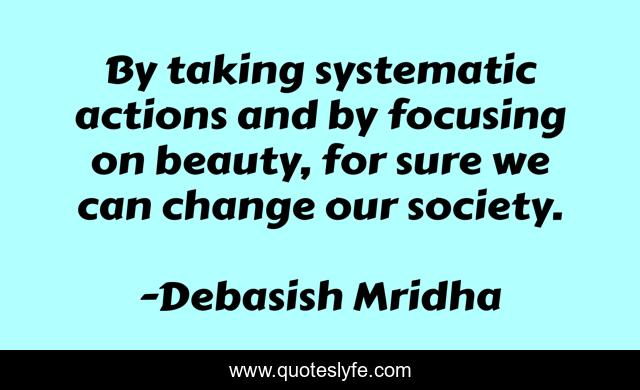 This page presents the quote "By taking systematic actions and by focusing on beauty, for sure we can change our society.". Author of this quote is Debasish Mridha. This quote is about debasish, mridha, philosophy, debasish-mridha, change-our-society, focusing-on-beauty, systematic-action,.