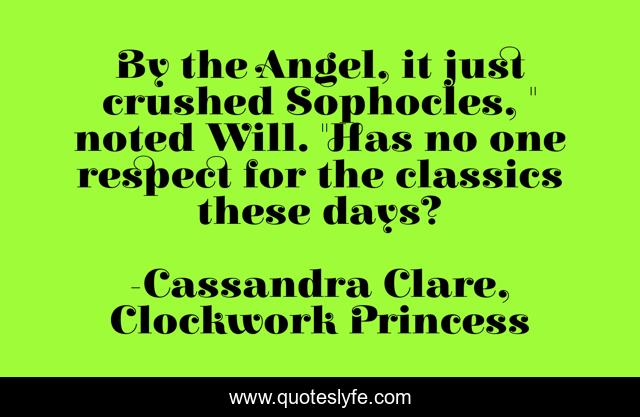 This page presents the quote "By the Angel, it just crushed Sophocles, " noted Will. "Has no one respect for the classics these days?". Author of this quote is Cassandra Clare, Clockwork Princess. .