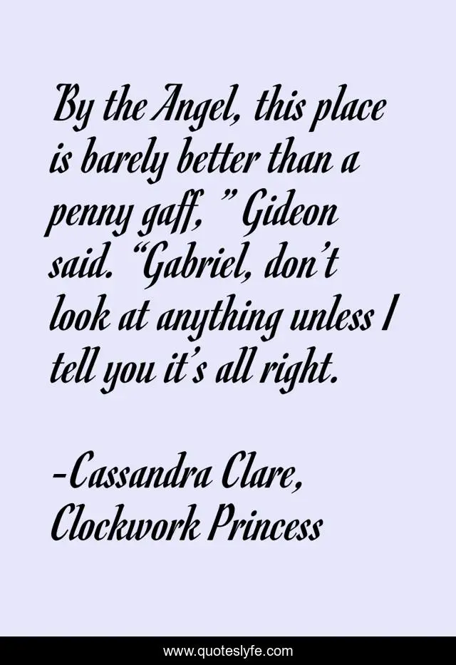 This page presents the quote "By the Angel, this place is barely better than a penny gaff, ” Gideon said. “Gabriel, don’t look at anything unless I tell you it’s all right.". Author of this quote is Cassandra Clare, Clockwork Princess. This quote is about humorous, gideon-lightwood,.