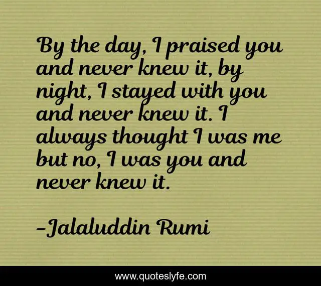 This page presents the quote "By the day, I praised you and never knew it, by night, I stayed with you and never knew it. I always thought I was me but no, I was you and never knew it.". Author of this quote is Jalaluddin Rumi. .