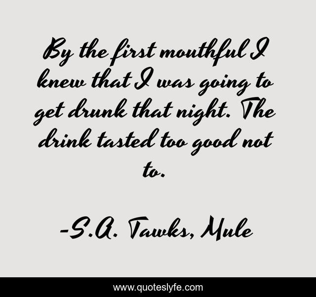 This page presents the quote "By the first mouthful I knew that I was going to get drunk that night. The drink tasted too good not to.". Author of this quote is S.A. Tawks, Mule. This quote is about bali, drunk, travel, indonesia, crime, drinking,.