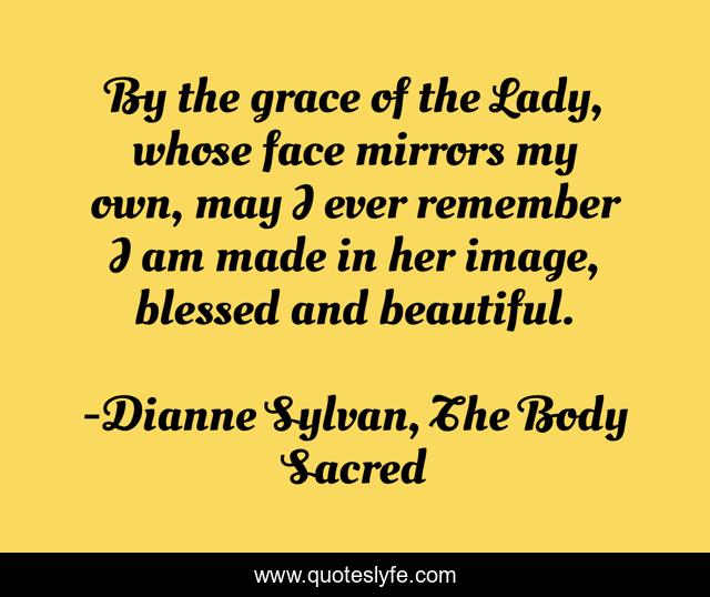 This page presents the quote "By the grace of the Lady, whose face mirrors my own, may I ever remember I am made in her image, blessed and beautiful.". Author of this quote is Dianne Sylvan, The Body Sacred. This quote is about body, spiritual, healing,.