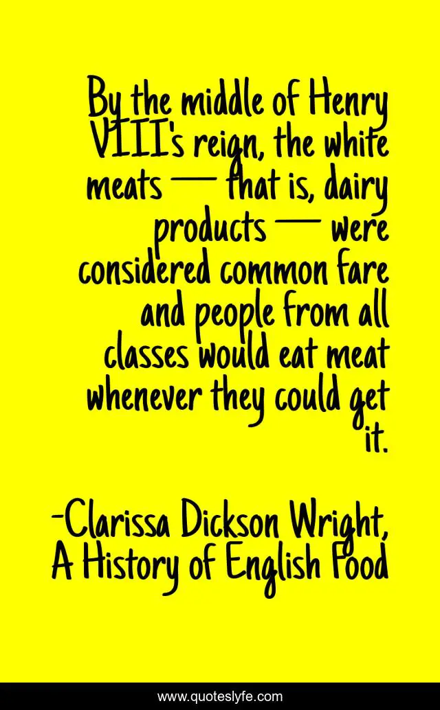 This page presents the quote "By the middle of Henry VIII's reign, the white meats — that is, dairy products — were considered common fare and people from all classes would eat meat whenever they could get it.". Author of this quote is Clarissa Dickson Wright, A History of English Food. This quote is about food, english-food, dairy, tudor-england,.