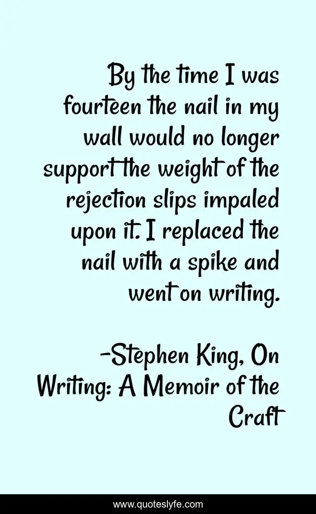 This page presents the quote "By the time I was fourteen the nail in my wall would no longer support the weight of the rejection slips impaled upon it. I replaced the nail with a spike and went on writing.". Author of this quote is Stephen King, On Writing: A Memoir of the Craft. This quote is about failure, inspirational, enthusiasm,.