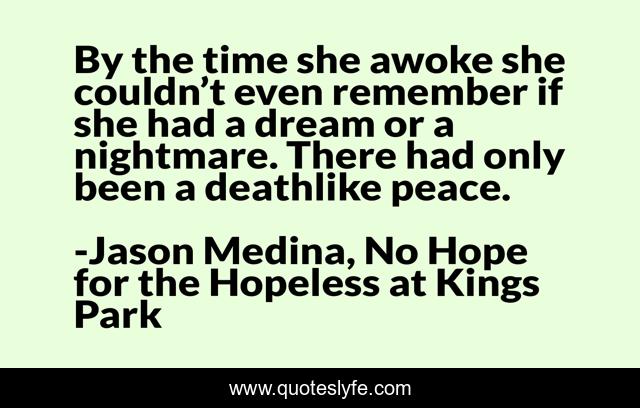 This page presents the quote "By the time she awoke she couldn’t even remember if she had a dream or a nightmare. There had only been a deathlike peace.". Author of this quote is Jason Medina, No Hope for the Hopeless at Kings Park. This quote is about dreams, death, building-122, kings-park, amanda, hospital, peace, kpsh, psych-ward,.