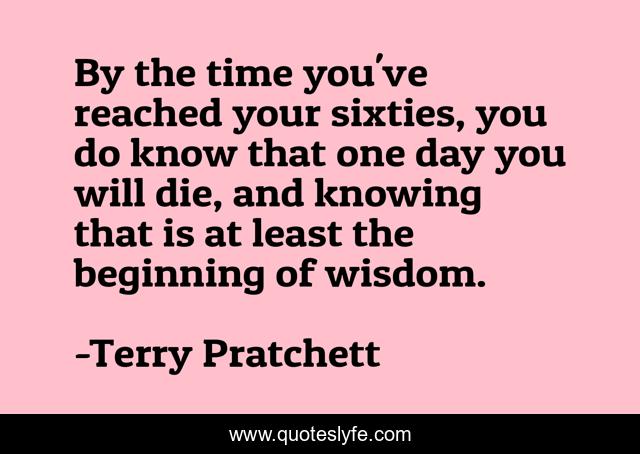 This page presents the quote "By the time you've reached your sixties, you do know that one day you will die, and knowing that is at least the beginning of wisdom.". Author of this quote is Terry Pratchett. This quote is about beginning, day, time,.