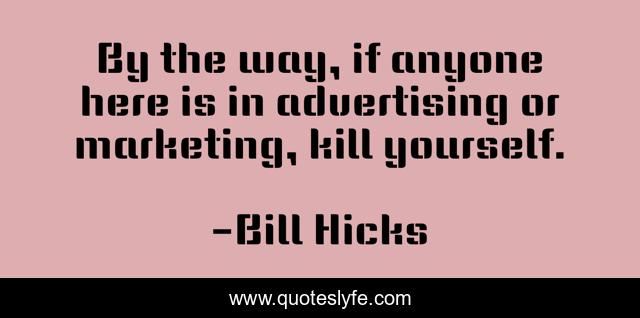 This page presents the quote "By the way, if anyone here is in advertising or marketing, kill yourself.". Author of this quote is Bill Hicks. This quote is about marketing, responsibility, advertising, consciousness, propaganda,.