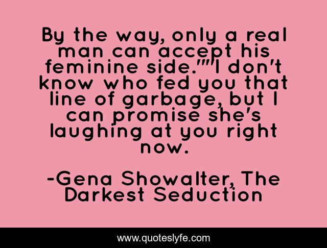 This page presents the quote "By the way, only a real man can accept his feminine side.""I don't know who fed you that line of garbage, but I can promise she's laughing at you right now.". Author of this quote is Gena Showalter, The Darkest Seduction. .