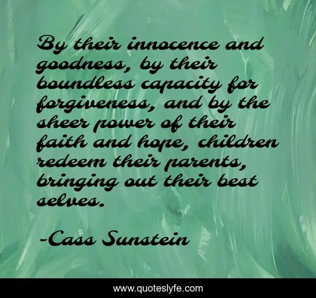 This page presents the quote "By their innocence and goodness, by their boundless capacity for forgiveness, and by the sheer power of their faith and hope, children redeem their parents, bringing out their best selves.". Author of this quote is Cass Sunstein. This quote is about forgiveness, children, hope,.