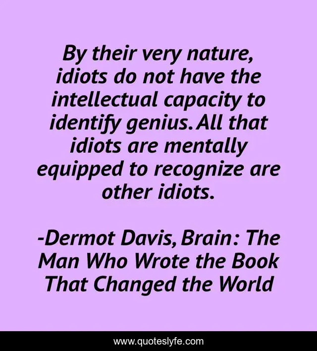 This page presents the quote "By their very nature, idiots do not have the intellectual capacity to identify genius. All that idiots are mentally equipped to recognize are other idiots.". Author of this quote is Dermot Davis, Brain: The Man Who Wrote the Book That Changed the World. This quote is about authors, literature, publishing, writing,.
