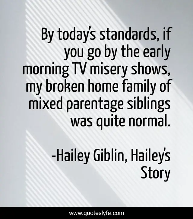 This page presents the quote "By today’s standards, if you go by the early morning TV misery shows, my broken home family of mixed parentage siblings was quite normal.". Author of this quote is Hailey Giblin, Hailey's Story. This quote is about jessica-chapman, soham-murders, the-soham-murders, maxine-carr, holly-wells, true-story, ian-huntley, stephen-richards, soham,.