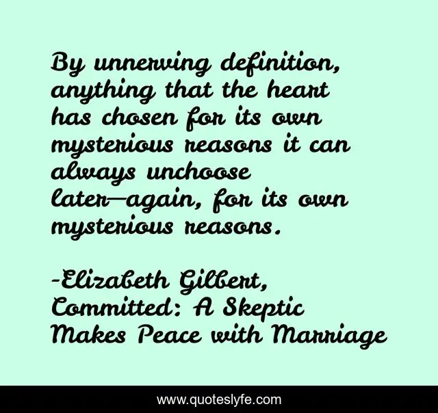 This page presents the quote "By unnerving definition, anything that the heart has chosen for its own mysterious reasons it can always unchoose later—again, for its own mysterious reasons.". Author of this quote is Elizabeth Gilbert, Committed: A Skeptic Makes Peace with Marriage. This quote is about heart, choice,.
