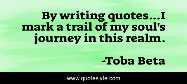 This page presents the quote "By writing quotes...I mark a trail of my soul's journey in this realm.". Author of this quote is Toba Beta. This quote is about life, journey, realm, mark-a-trail, soul,.