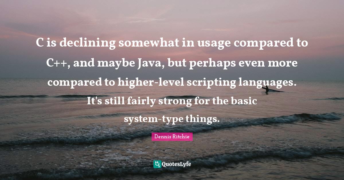 This page presents the quote "C is declining somewhat in usage compared to C++, and maybe Java, but perhaps even more compared to higher-level scripting languages. It's still fairly strong for the basic system-type things.". Author of this quote is Dennis Ritchie. This quote is about usage, type, strong, levels, higher, java,.