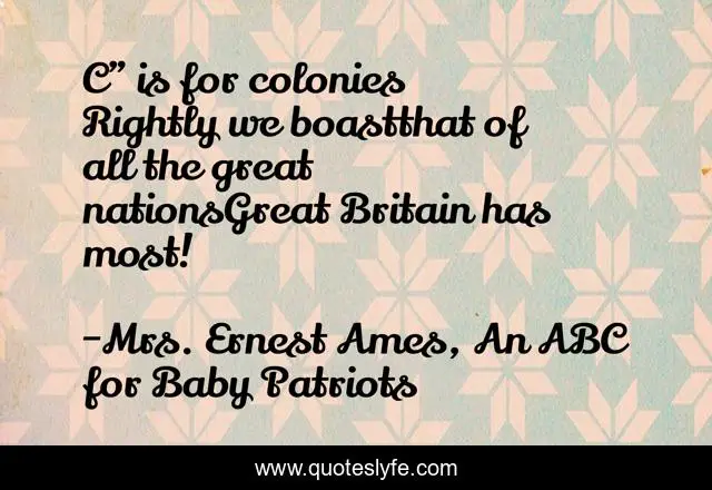 "Mrs. Ernest Ames, An ABC for Baby Patriots Quotes." Quoteslyfe.com, 2025. Sat. 06 Dec. 2025. <https://www.quoteslyfe.com/quote/C-is-for-colonies-Rightly-we-boastthat-240709>.