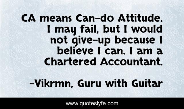 This page presents the quote "CA means Can-do Attitude. I may fail, but I would not give-up because I believe I can. I am a Chartered Accountant.". Author of this quote is Vikrmn, Guru with Guitar. This quote is about gwg, believe, vikram, positive, motivational, attitude, ca-vikram-verma, guru-with-guitar, behaviour,.