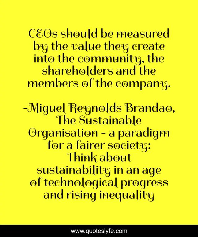 "Miguel Reynolds Brandao, The Sustainable Organisation - a paradigm for a fairer society: Think about sustainability in an age of technological progress and rising inequality Quotes." Quoteslyfe.com, 2025. Fri. 05 Dec. 2025. <https://www.quoteslyfe.com/quote/CEOs-should-be-measured-by-the-value-209908>.