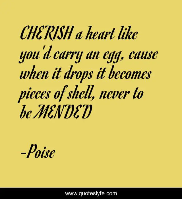 This page presents the quote "CHERISH a heart like you'd carry an egg, cause when it drops it becomes pieces of shell, never to be MENDED". Author of this quote is Poise. This quote is about trust, love, affection, cherish,.