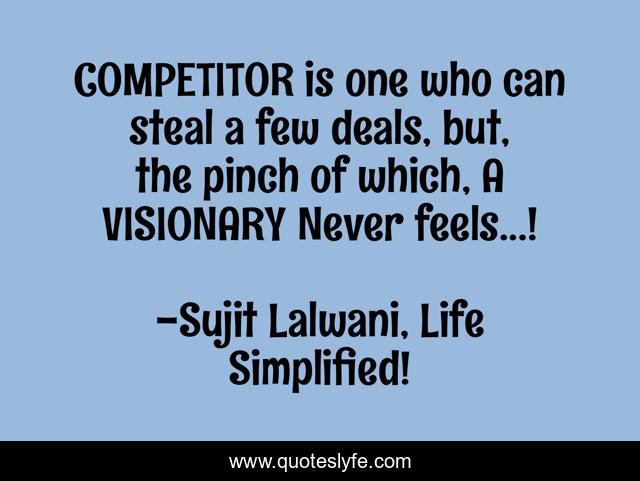 This page presents the quote "COMPETITOR is one who can steal a few deals, but, the pinch of which, A VISIONARY Never feels...!". Author of this quote is Sujit Lalwani, Life Simplified!. This quote is about life, success, visionary, competition, inspirational, enthusiasm,.