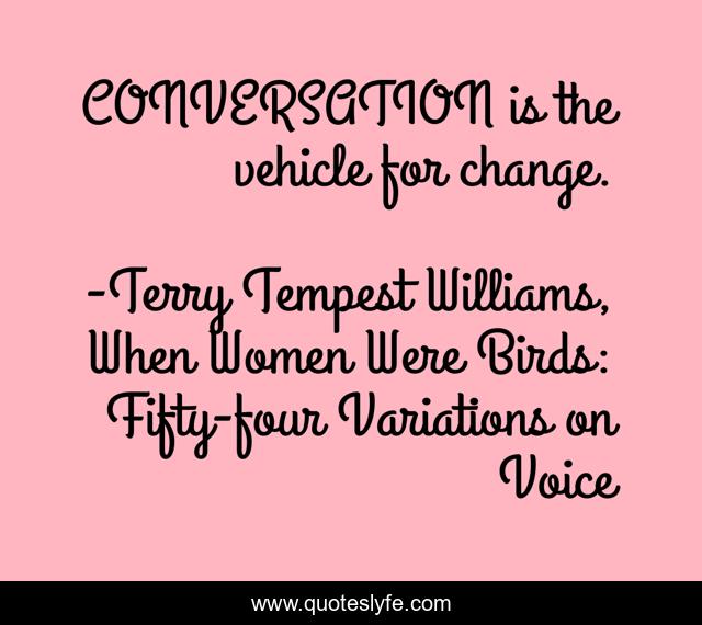 "Terry Tempest Williams, When Women Were Birds: Fifty-four Variations on Voice Quotes." Quoteslyfe.com, 2025. Fri. 05 Dec. 2025. <https://www.quoteslyfe.com/quote/CONVERSATION-is-the-vehicle-for-change-258110>.