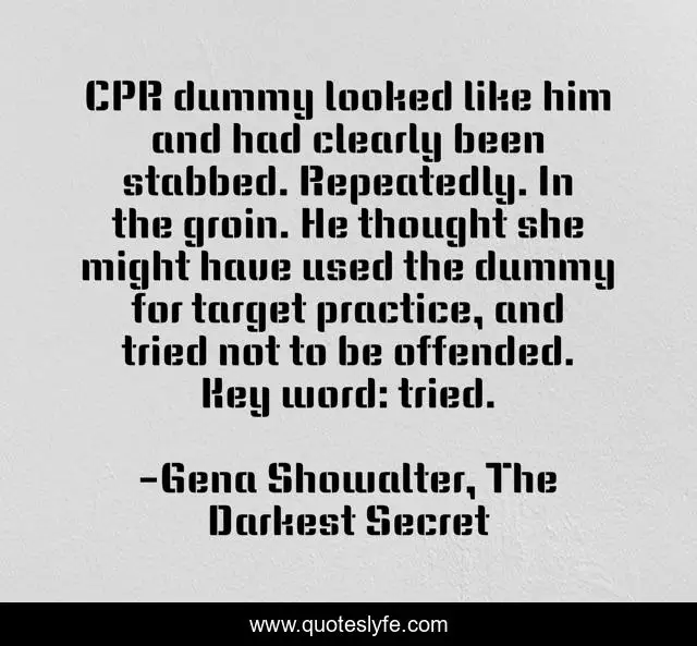 This page presents the quote "CPR dummy looked like him and had clearly been stabbed. Repeatedly. In the groin. He thought she might have used the dummy for target practice, and tried not to be offended. Key word: tried.". Author of this quote is Gena Showalter, The Darkest Secret. This quote is about funny, comedy, humor, fantasy-books,.