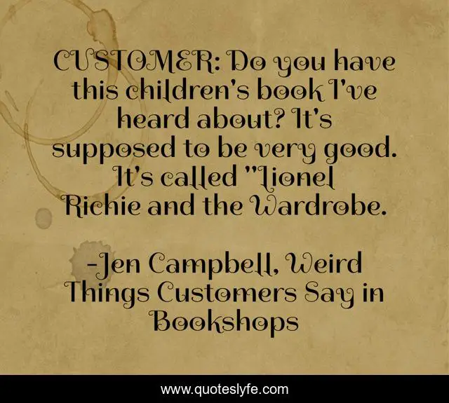 This page presents the quote "CUSTOMER: Do you have this children's book I've heard about? It's supposed to be very good. It's called "Lionel Richie and the Wardrobe.". Author of this quote is Jen Campbell, Weird Things Customers Say in Bookshops. .