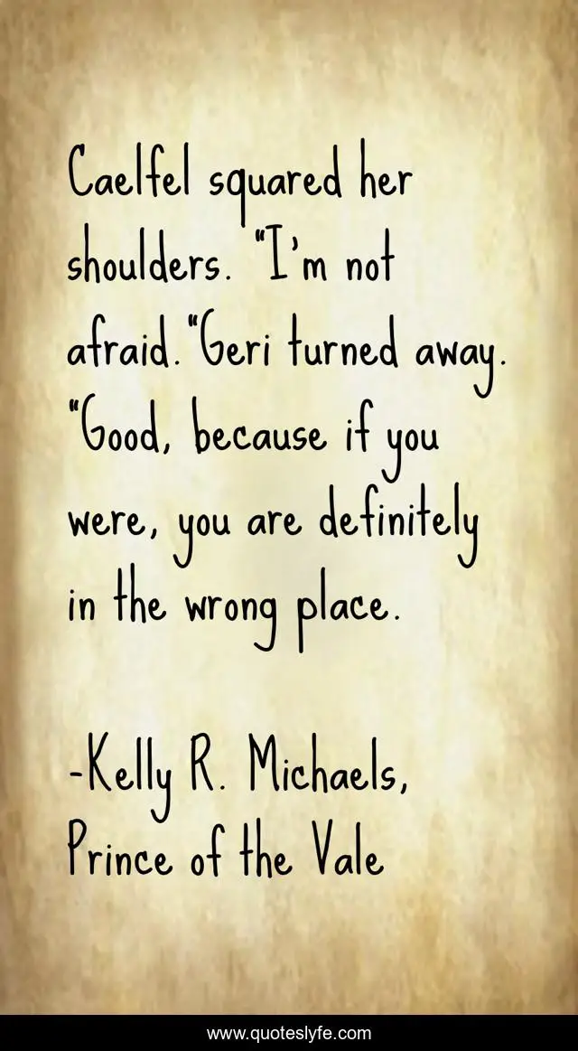 This page presents the quote "Caelfel squared her shoulders. “I’m not afraid.”Geri turned away. “Good, because if you were, you are definitely in the wrong place.". Author of this quote is Kelly R. Michaels, Prince of the Vale. This quote is about caelfel, fantasy, ariang-ron, geri, werewolves, silver-crown, elves,.