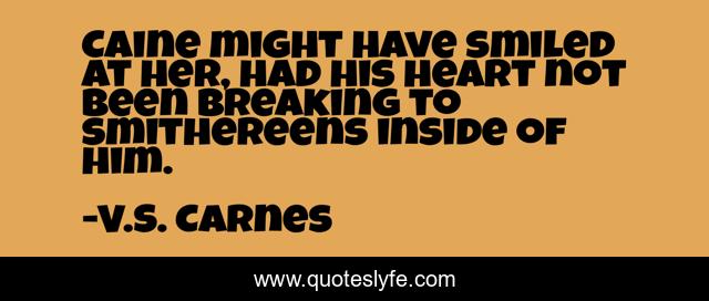 This page presents the quote "Caine might have smiled at her, had his heart not been breaking to smithereens inside of him.". Author of this quote is V.S. Carnes. This quote is about heartache, romance, heartbreak, love, affection,.