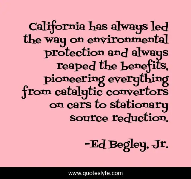 This page presents the quote "California has always led the way on environmental protection and always reaped the benefits, pioneering everything from catalytic convertors on cars to stationary source reduction.". Author of this quote is Ed Begley, Jr.. This quote is about protection, california, way,.