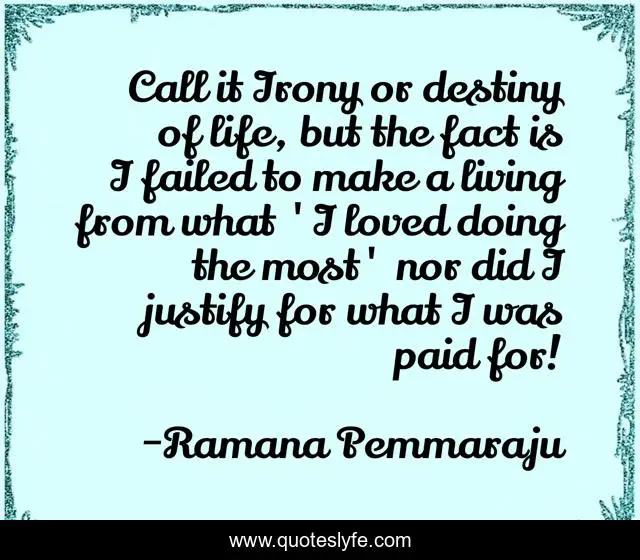 This page presents the quote "Call it Irony or destiny of life, but the fact is I failed to make a living from what 'I loved doing the most' nor did I justify for what I was paid for!". Author of this quote is Ramana Pemmaraju. This quote is about living, passion, destiny, irony-of-life,.