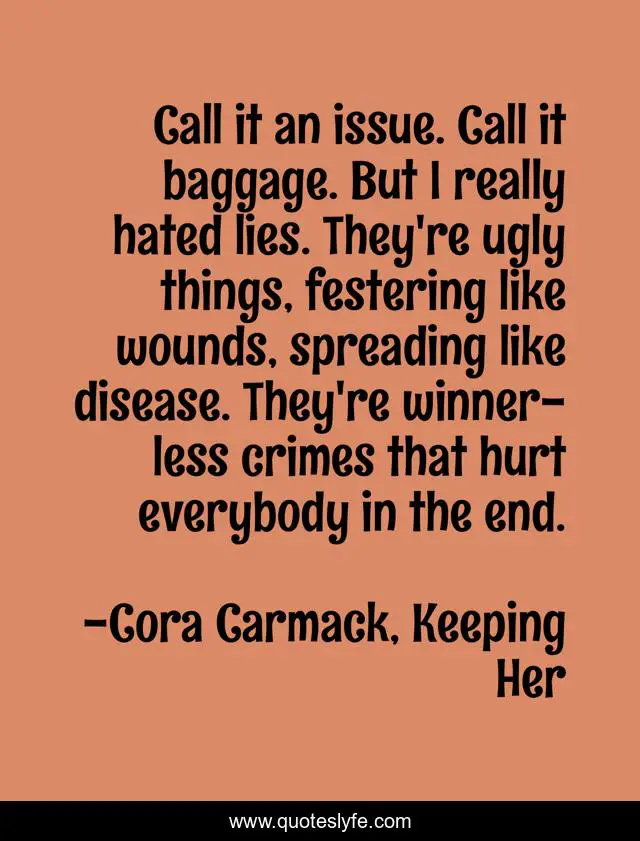 This page presents the quote "Call it an issue. Call it baggage. But I really hated lies. They're ugly things, festering like wounds, spreading like disease. They're winner-less crimes that hurt everybody in the end.". Author of this quote is Cora Carmack, Keeping Her. .