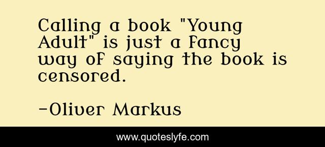 This page presents the quote "Calling a book "Young Adult" is just a fancy way of saying the book is censored.". Author of this quote is Oliver Markus. This quote is about corporate-america, censored-books, ya, censored, books, censorship, banned-books, young-adult, forbidden-books,.