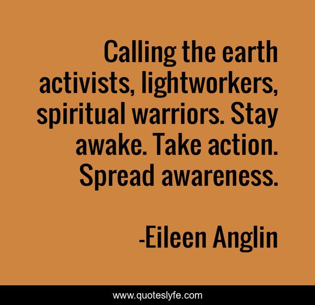 This page presents the quote "Calling the earth activists, lightworkers, spiritual warriors. Stay awake. Take action. Spread awareness.". Author of this quote is Eileen Anglin. This quote is about human-rights, activism, climate-crisis, environmental-protection, poverty-inequality,.