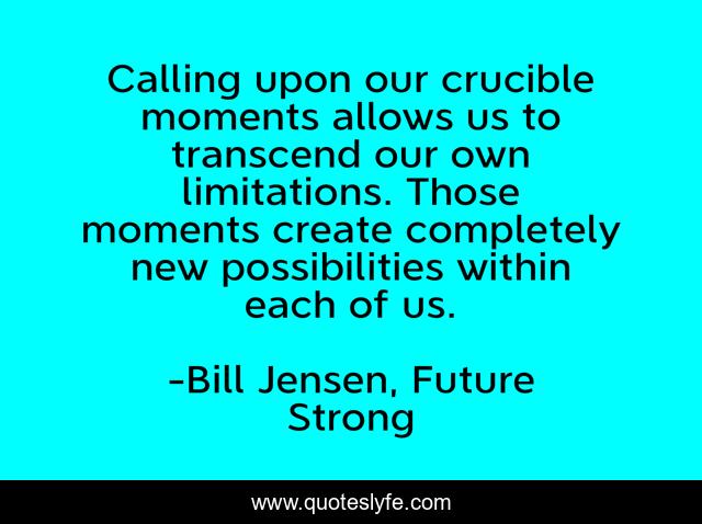 This page presents the quote "Calling upon our crucible moments allows us to transcend our own limitations. Those moments create completely new possibilities within each of us.". Author of this quote is Bill Jensen, Future Strong. This quote is about enthusiasm, future, leadership, inspirational, self-help,.