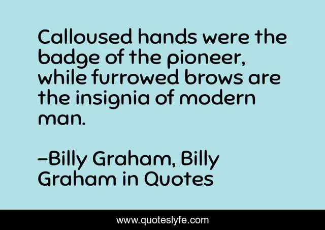 This page presents the quote "Calloused hands were the badge of the pioneer, while furrowed brows are the insignia of modern man.". Author of this quote is Billy Graham, Billy Graham in Quotes. This quote is about work, billy-graham,.