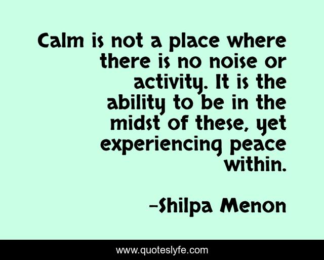 This page presents the quote "Calm is not a place where there is no noise or activity. It is the ability to be in the midst of these, yet experiencing peace within.". Author of this quote is Shilpa Menon. This quote is about calmness-and-attitude, peace,.