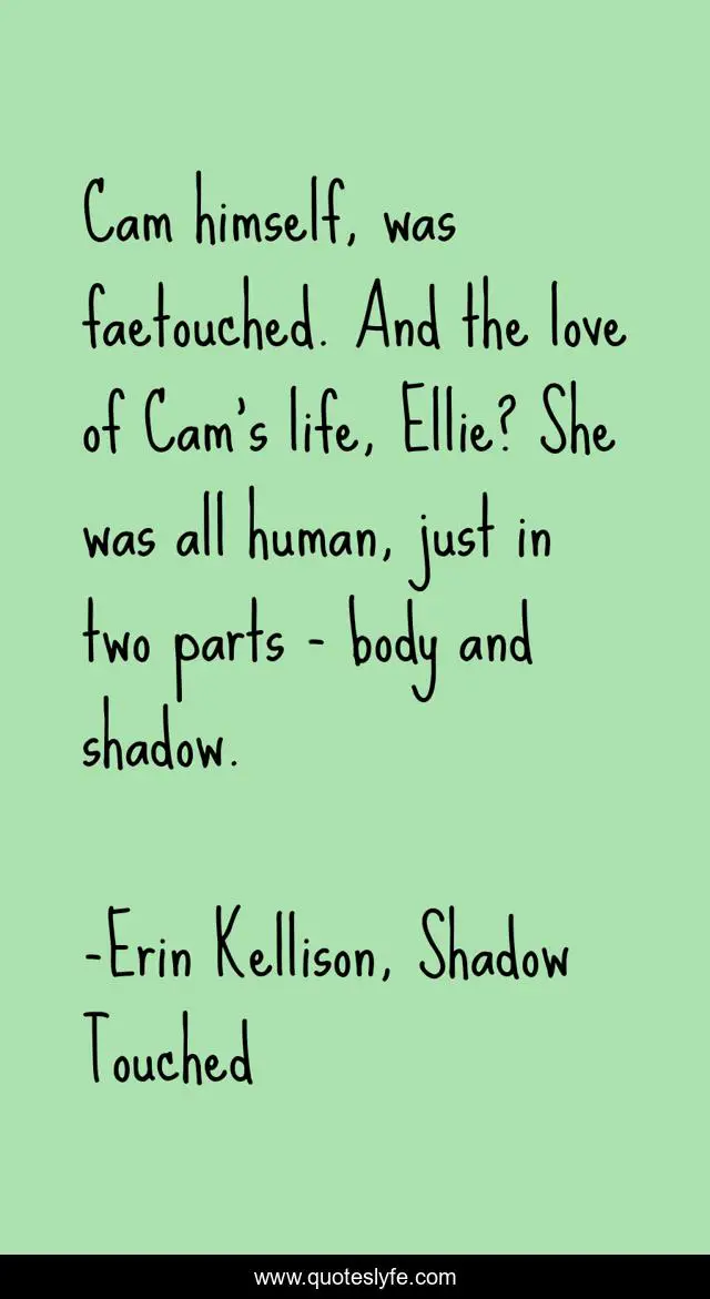 This page presents the quote "Cam himself, was faetouched. And the love of Cam's life, Ellie? She was all human, just in two parts - body and shadow.". Author of this quote is Erin Kellison, Shadow Touched. This quote is about dark, mages, uf, paranormal,.
