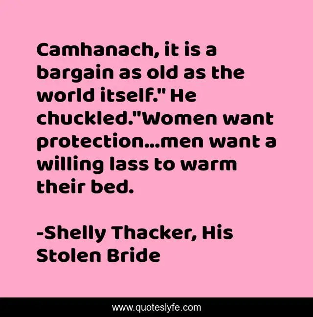 This page presents the quote "Camhanach, it is a bargain as old as the world itself." He chuckled."Women want protection...men want a willing lass to warm their bed.". Author of this quote is Shelly Thacker, His Stolen Bride. This quote is about highlanders-romance, historical-romance,.