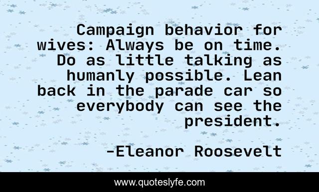 This page presents the quote "Campaign behavior for wives: Always be on time. Do as little talking as humanly possible. Lean back in the parade car so everybody can see the president.". Author of this quote is Eleanor Roosevelt. This quote is about see, behavior, time,.