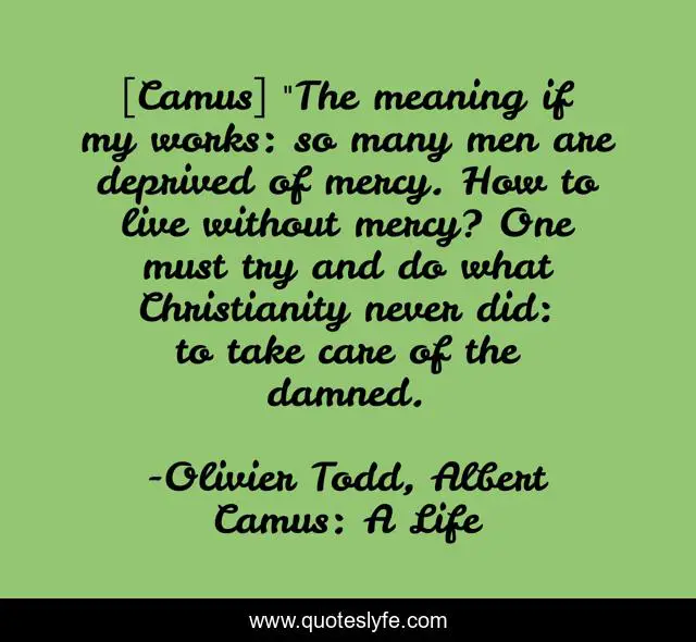 This page presents the quote "[Camus] "The meaning if my works: so many men are deprived of mercy. How to live without mercy? One must try and do what Christianity never did: to take care of the damned.". Author of this quote is Olivier Todd, Albert Camus: A Life. This quote is about mercy, damned, christianity,.