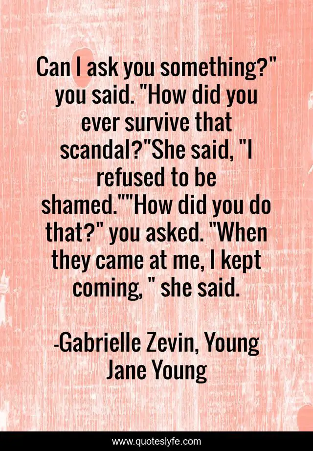 This page presents the quote "Can I ask you something?" you said. "How did you ever survive that scandal?"She said, "I refused to be shamed.""How did you do that?" you asked. "When they came at me, I kept coming, " she said.". Author of this quote is Gabrielle Zevin, Young Jane Young. This quote is about fortitude, self-confidence, shame,.