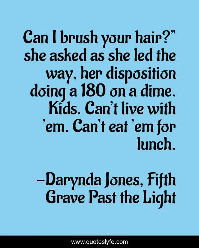 This page presents the quote "Can I brush your hair?” she asked as she led the way, her disposition doing a 180 on a dime. Kids. Can’t live with ’em. Can’t eat ’em for lunch.". Author of this quote is Darynda Jones, Fifth Grave Past the Light. This quote is about funny, kids, comedy, humour,.