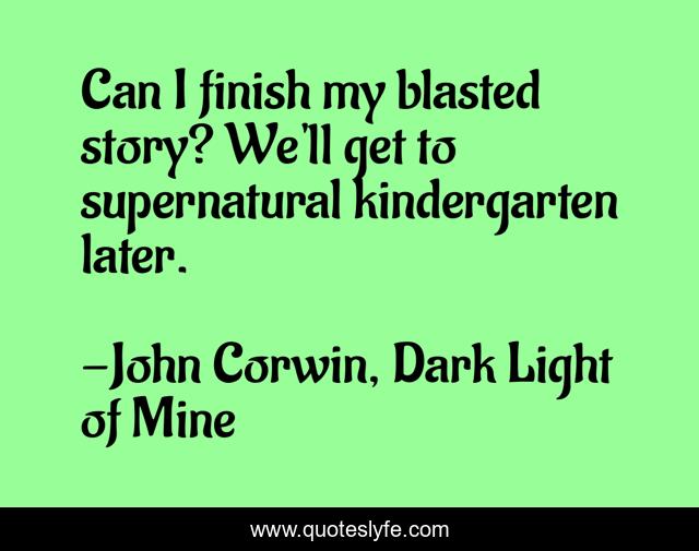 This page presents the quote "Can I finish my blasted story? We'll get to supernatural kindergarten later.". Author of this quote is John Corwin, Dark Light of Mine. This quote is about kindergarten, supernatural,.