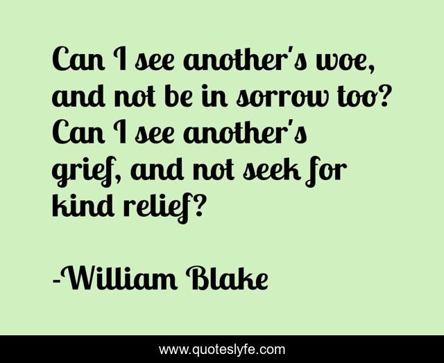 This page presents the quote "Can I see another's woe, and not be in sorrow too? Can I see another's grief, and not seek for kind relief?". Author of this quote is William Blake. This quote is about grief, sorrow, see,.