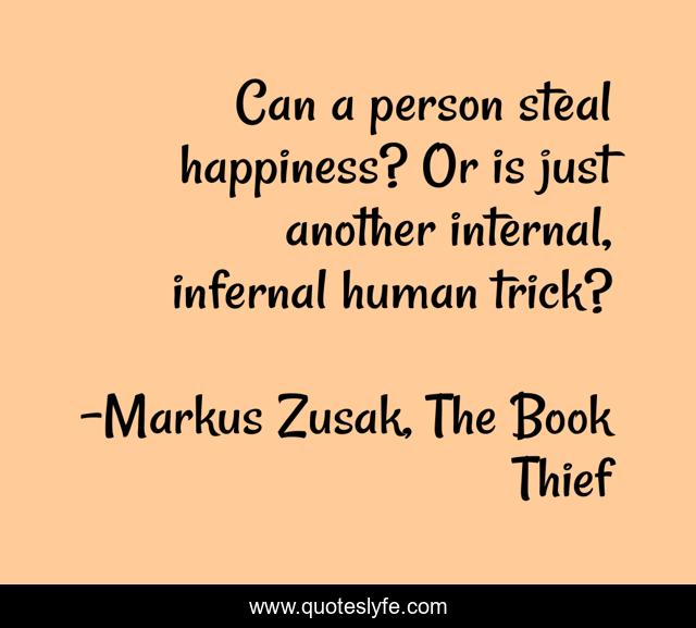 This page presents the quote "Can a person steal happiness? Or is just another internal, infernal human trick?". Author of this quote is Markus Zusak, The Book Thief. This quote is about life, happiness,.