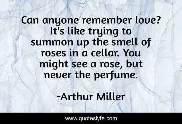 This page presents the quote "Can anyone remember love? It's like trying to summon up the smell of roses in a cellar. You might see a rose, but never the perfume.". Author of this quote is Arthur Miller. This quote is about rose, remember, roses,.