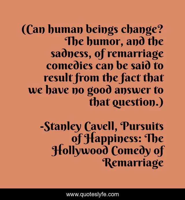 This page presents the quote "(Can human beings change? The humor, and the sadness, of remarriage comedies can be said to result from the fact that we have no good answer to that question.)". Author of this quote is Stanley Cavell, Pursuits of Happiness: The Hollywood Comedy of Remarriage. This quote is about humor, hope, remarriage, marriage, change, romantic-comedy, happiness,.