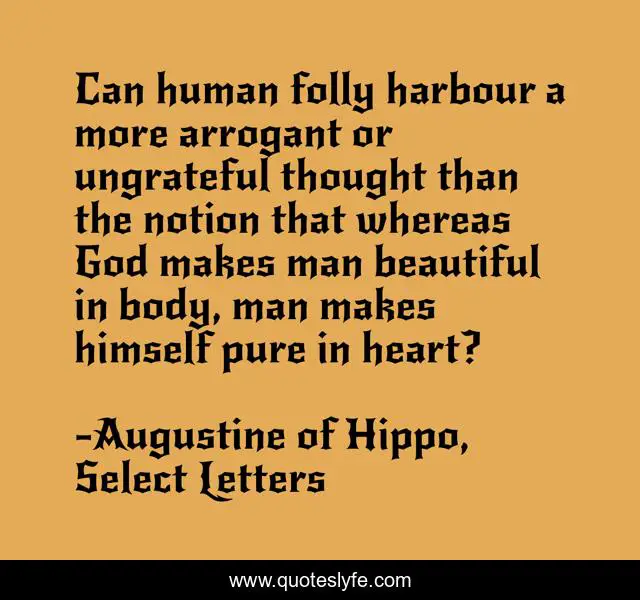 This page presents the quote "Can human folly harbour a more arrogant or ungrateful thought than the notion that whereas God makes man beautiful in body, man makes himself pure in heart?". Author of this quote is Augustine of Hippo, Select Letters. This quote is about human-folly, purity, beauty,.