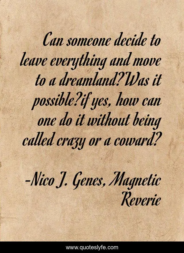 This page presents the quote "Can someone decide to leave everything and move to a dreamland?Was it possible?if yes, how can one do it without being called crazy or a coward?". Author of this quote is Nico J. Genes, Magnetic Reverie. This quote is about fantasy-romance, crazy, love, relationship, coward, crazy-love, dreams, dreamland, dream,.