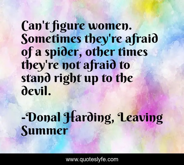 This page presents the quote "Can't figure women. Sometimes they're afraid of a spider, other times they're not afraid to stand right up to the devil.". Author of this quote is Donal Harding, Leaving Summer. This quote is about fear, women,.